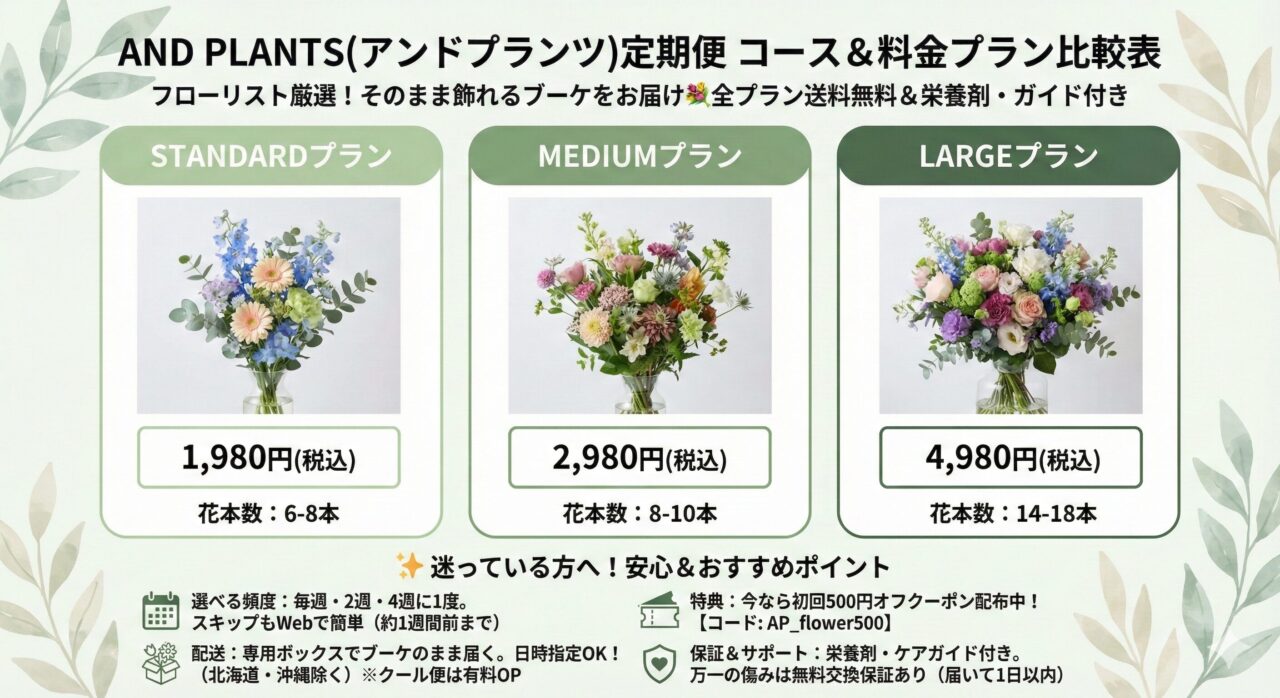 AND PLANTS(アンドプランツ)の花の定期便について、特徴をまとめました。